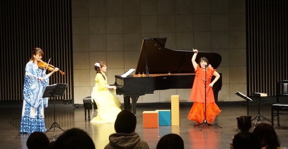 乳幼児のための生の音楽会。会場全体に広がる、チェロやピアノ、ヴァイオリンの演奏をドレミちゃんと一緒に楽しみます。